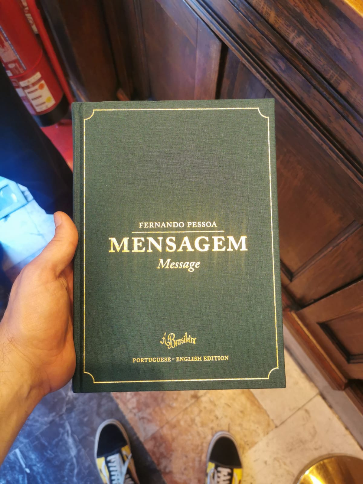 Planning a trip to Portugal? If so, make sure you stop by the Café A Brasileira, where you can pick up a hardcover deluxe edition of my translation of Fernando Pessoa’s Message. My friend Stephen Harris of bigbeaverdiaries.com happened to be in the Chiado neighborhood of Lisbon recently, so I sent him in search of my book. This is what he found: