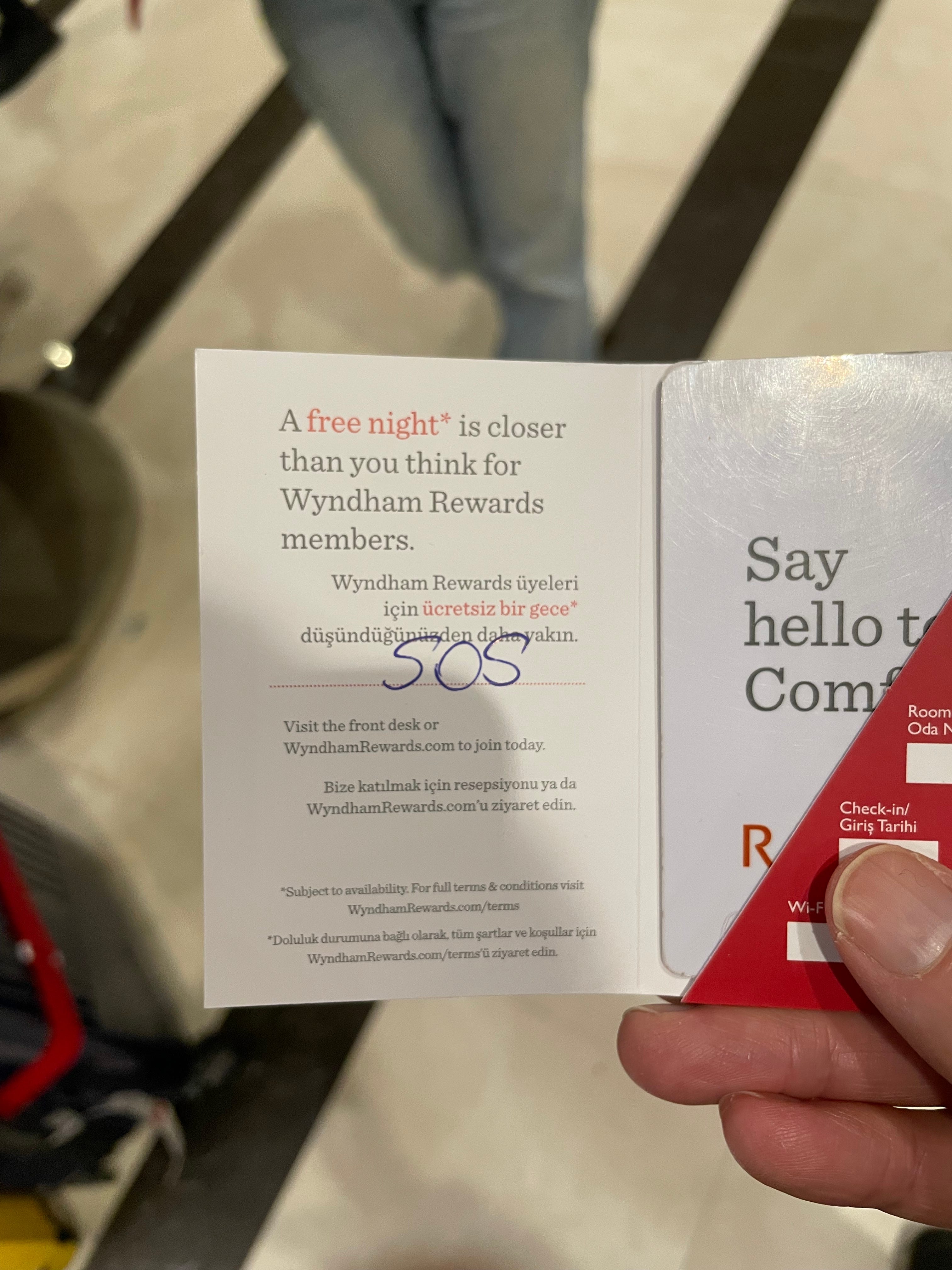 We arrive on the bus at the Ramada Inn, which the itinerary has assured us is a five-star hotel. Outside, it is snowing lightly, which reminds me of Orhan Pamuk’s most famous novel. It is much colder here than it was in Taipei. We wait in the lobby as Gökhan and Andy collect all the passports to facilitate group check-in. Soon Gökhan gives us the key to our room. The plastic doorkey is in a cardboard sleeve on which is written the room number 505—but the fives look less like numbers and more like letter esses. This would seem to be a bad omen and it proves to be so when we enter the room thus designated “SOS.” There is a burned-out light in the bedroom. The vent is moldy and a screw is missing from its screen, which looks as though it might fall off the wall at any moment. The shower is scalding hot and we cannot figure out how to adjust the temperature. The icing on the cake, as it were, is what appears to be a clump of nosehairs encrusted with dried snot, which has been left for our edification on the writing desk next to the TV. Is this what qualifies as a five-star lodging experience in Türkiye?